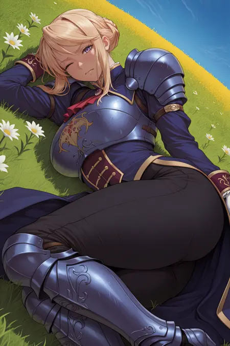 Add "blue coat, shoulder armor, breastplate, armor, sleeve cuffs, red ascot, black pants, high-waist pants, white gloves, armored boots" for her regular uniform with armor.