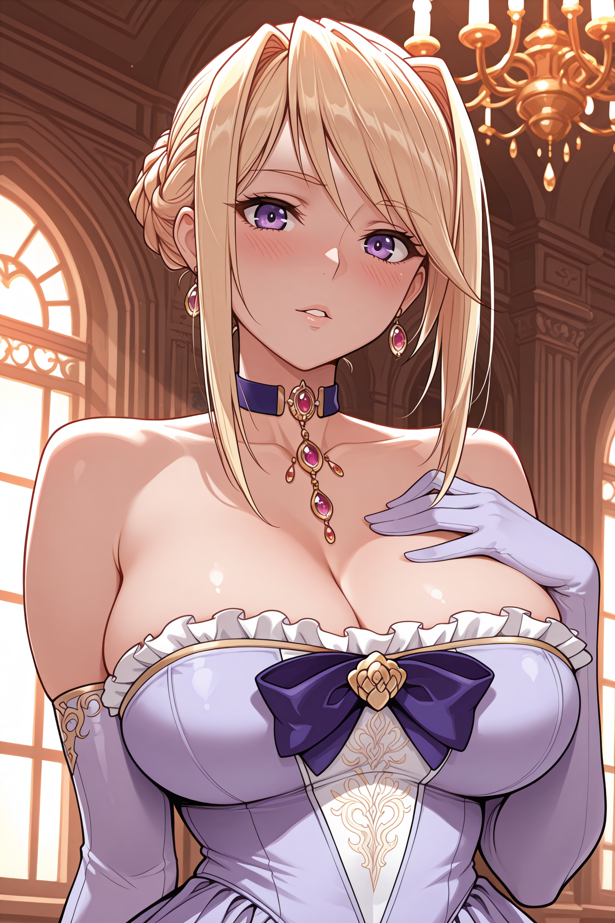 Add "earrings, pendant choker, light purple dress, frilled dress, purple bow, cleavage, strapless, long dress, elbow gloves, light purple gloves" for her dress.