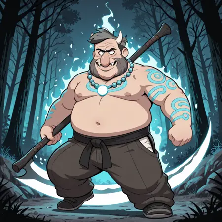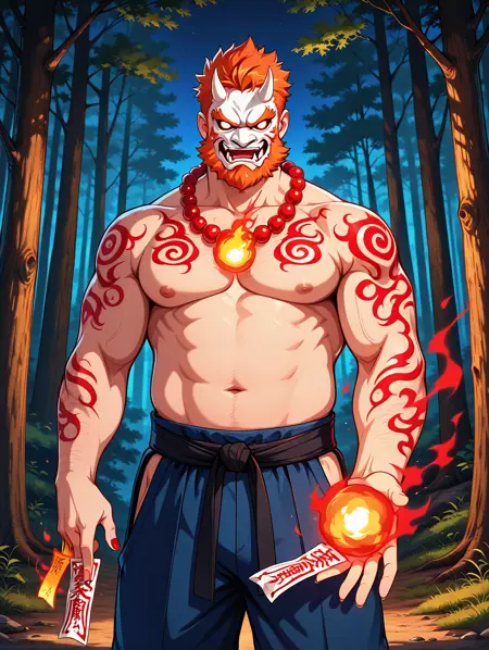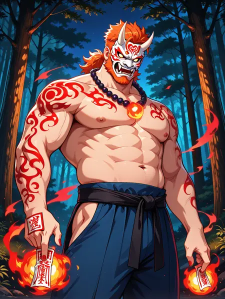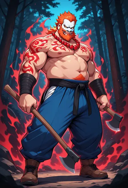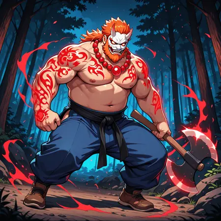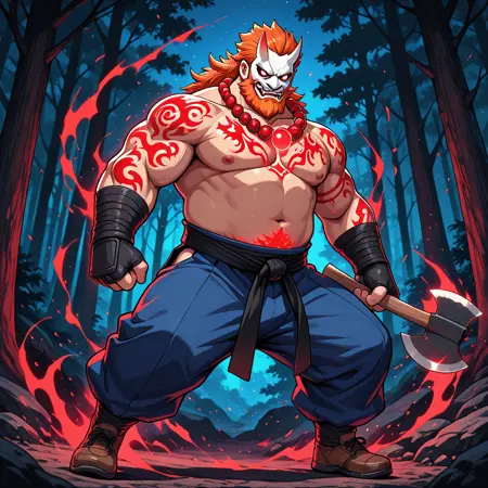 Ragnar, 1man, male, mature male, bulky, big, orange hair, orange beard, white oni mask, white horns, pure white eyes, shirtless, red bead necklace, glowing red tattoos, black martial arts sash, blue pants, brown shoes, holding an axe, red aura,