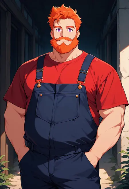 Magnus, 1man, male, mature male, bulky, big, belly, orange hair, orange eyebrows, orange mustache, orange beard, purple eyes, red t-shirt, dark blue overalls, brown boots,