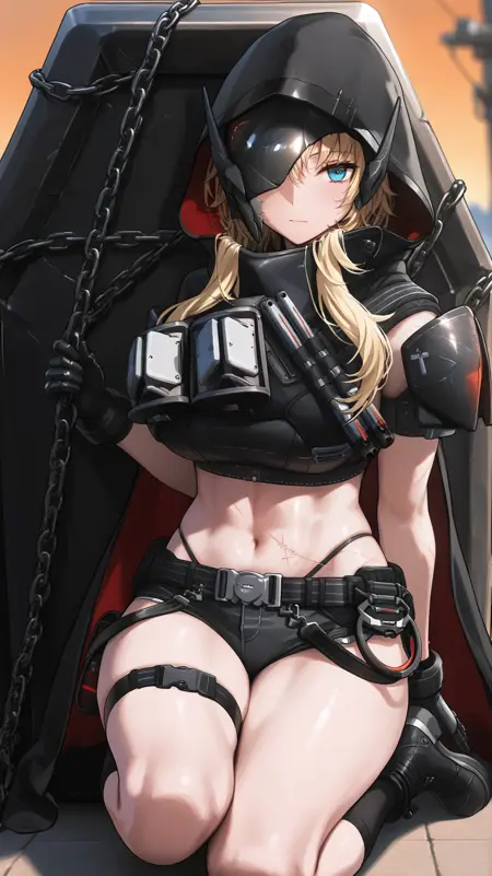 후드, 허벅지 스트랩, 허벅지, 부츠, 검은 장갑, 허리, 벨트, 망토, 검은 신발, 갑옷, 크롭탑, 짧은 반바지, 허벅지 스트랩, 검은 반바지, 검은 양말,