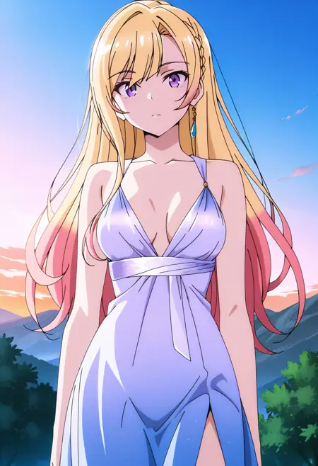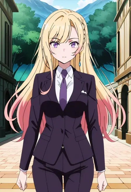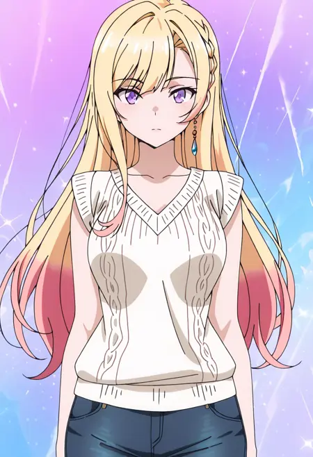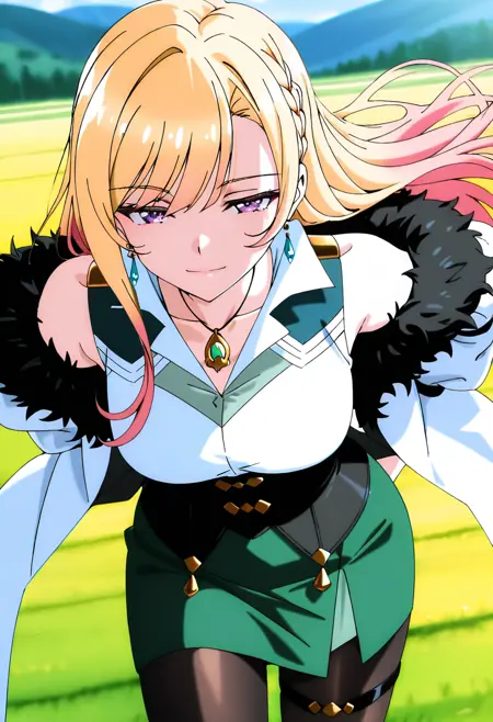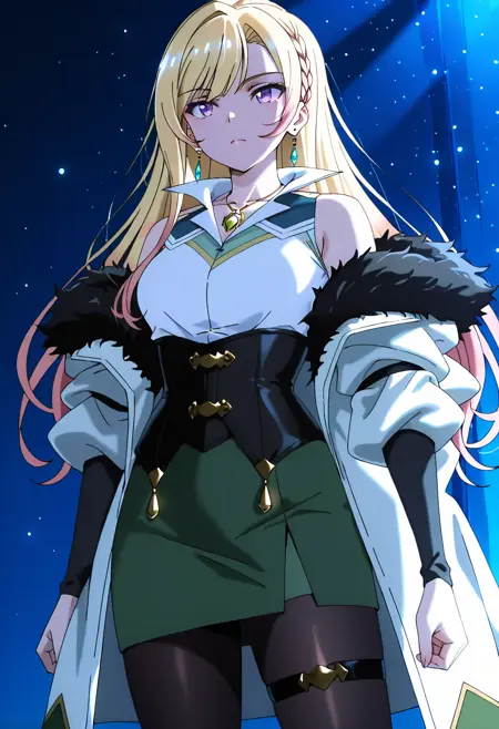 | 학습된 단어 | 1girl, solo, multicolored hair, blonde hair, pink hair, colored tips, hair between eyes, long hair, swept bangs, sidelocks, side braid, purple eyes, medium breasts복사됨! collarbone, earrings, necklace, multicolored shirt, white shirt, collared shirt, popped collar, sleeveless shirt, off-shoulder jacket, black corset, bare shoulders, green skirt, pencil skirt, black pantyhose, thigh strap, fur-trimmed jacket, multicolored jacket, white jacket, green jacket, open jacket, puffy long sleeves, two-sided jacket, white high heels복사됨! |