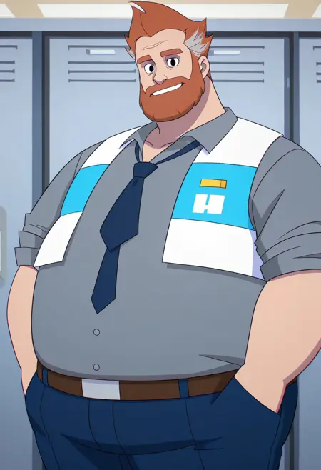 Phil, 1man, male, mature male, chubby, fat, obese, orange hair, orange eyebrows, grey hair streaks, beard, black eyes, round ears, grey collared shirt, dark blue necktie, white vest, brown belt, blue jeans, brown shoes,
