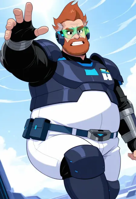 PhilGT, 1man, male, mature male, chubby, fat, obese, orange hair, orange eyebrows, dark grey hair streaks, beard, black eyes, green visors, round ears, white bodysuit, dark blue armor, black sleeves, black fingerless gloves, silver gauntlet, dark blue belt, light blue knee pads, dark blue boots,