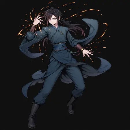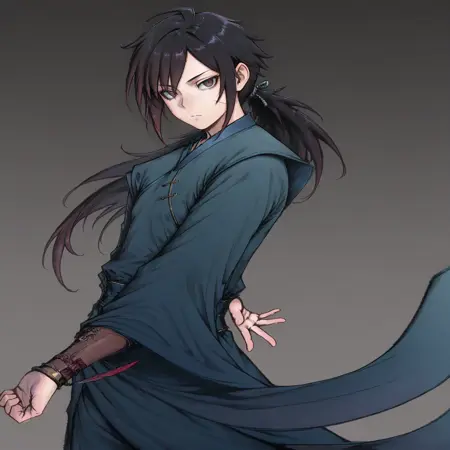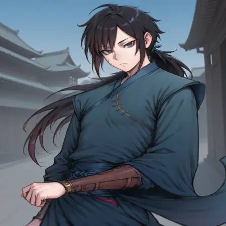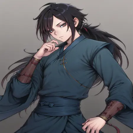 solo, 1boy, long hair, ponytail, arm guards, brown eyes, black hair, scar, looking at viewer, chinese clothes, long sleeves, low ponytail, scar on face, Dangpoui