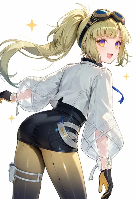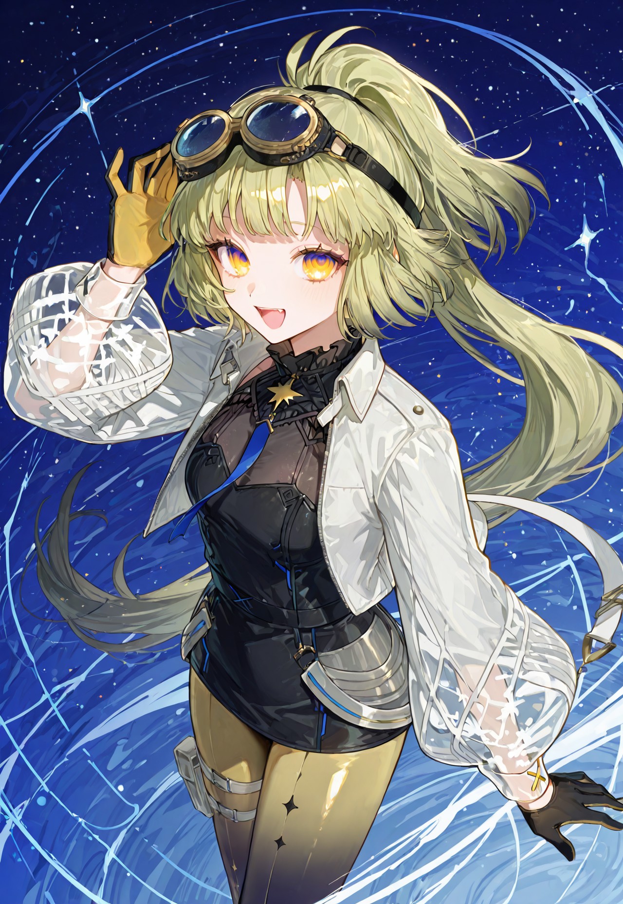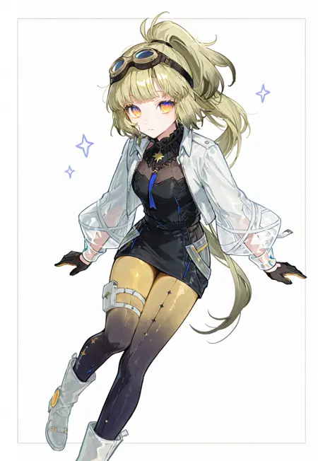 nonoka_arcaea, blonde hair, gradient hair, short hair, tied hair, ponytail, high ponytail, black hairband ponytail, bangs, black goggles, printed goggles, goggles on hair, yellow eyes, gradient eyes, white jacket, long sleeves, puffy sleeves, transparent sleeves, two-tone gloves, black gloves, yellow palm gloves, black dress, frilled collar, micro dress, sleeveless dress, pencil skirt, mech ornaments, transparent dress, transparent cleavage, star ornament, blue tassel, yellow pants, gradient pants, patterned pants, white thigh straps, thigh pouch, white boots,