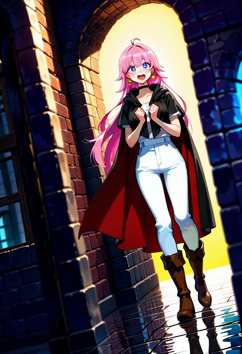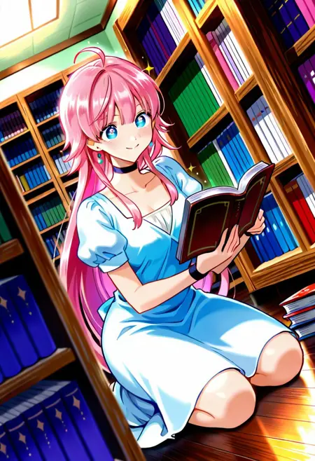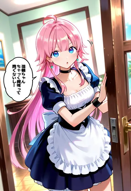 Masterpiece, manga, full color, 1girl, solo, claire, blue eyes, ahoge, long hair, pink hair, choker, earrings, jewelry,