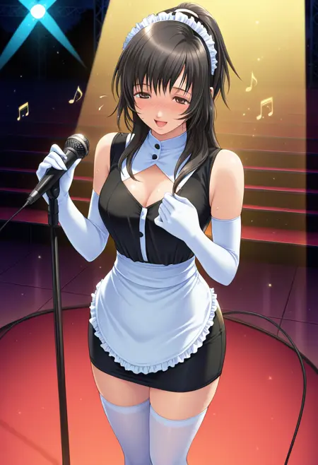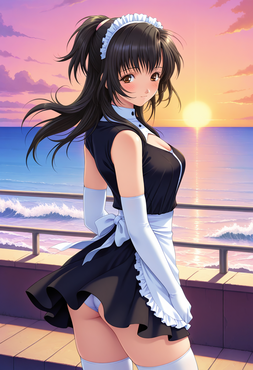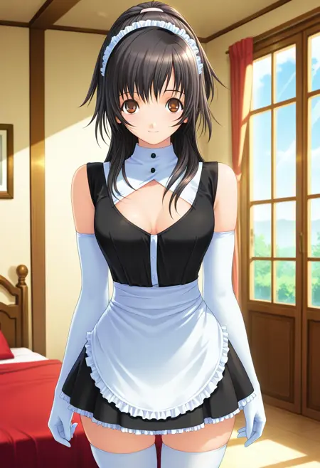 メイド, メイドの頭飾り, 黒のノースリーブドレス, 胸元の切り替え, 胸元, 白いエルボーグローブ, 白いウェストエプロン, 絶対領域, 白いハイソックス,