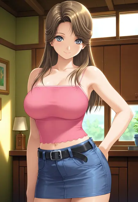 粉色吊带衫, 露脐, 黑色腰带, 牛仔裙, 超短裙,