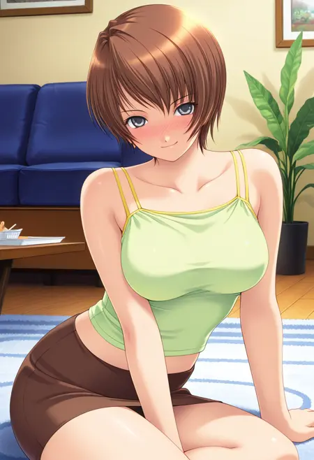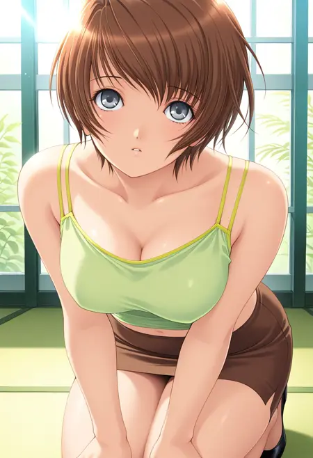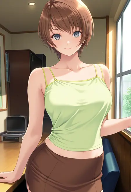 - 薄緑のキャミソール, 腹筋, 茶色のペンシルスカート, ミニスカート