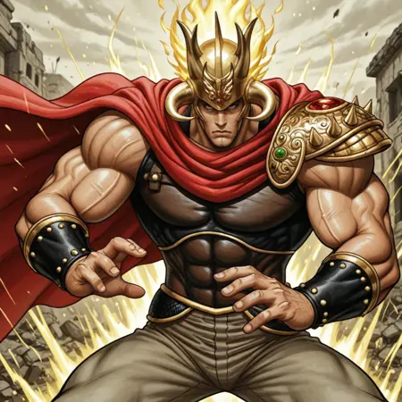 망토 착용 시: Hokuto_Raoh, 한쪽 어깨 패드, 검은 팔찌, 거대한 근육, 강인한 남자, 뿔, 헬멧, 붉은 망토,