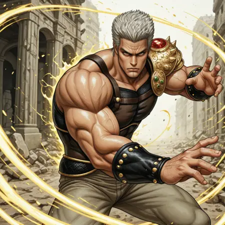 전투 시: Hokuto_Raoh, 회색 머리, 한쪽 어깨 패드, 검은 팔찌, 거대한 근육, 강인한 남자,