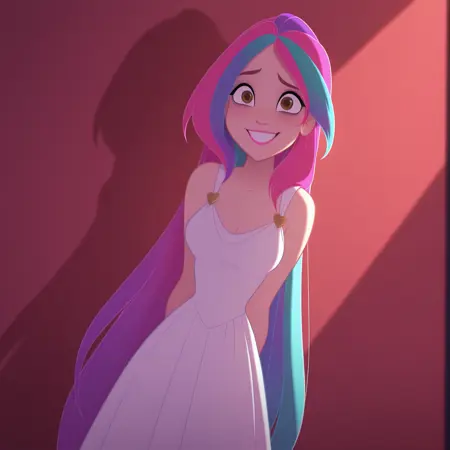 Iris: ir1s, 1girl, very long hair, brown eyes, breasts, pink lipstick, cleavage, multicolored hair, pink hair, purple hair, aqua hair, rainbow hair, white dress