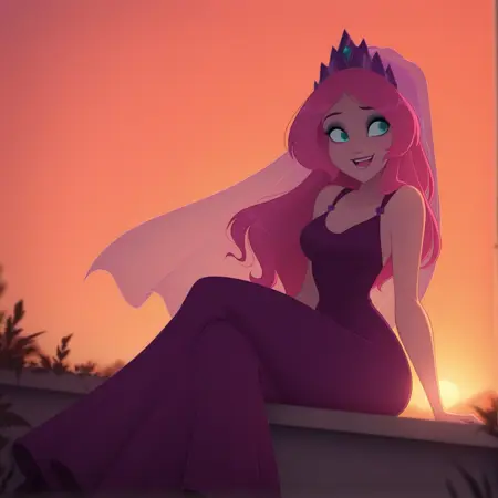 Persephone: pers3phone, 1girl, long hair, pink hair, colored skin, pink skin, breasts, cleavage, pink eyes, purple eyes, pink lips, bangs, big hair, sidelocks, purple dress, hair ornament, hair flower, rose, pink rose, makeup