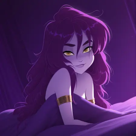 Eris: er1s, 1girl, long hair, yellow eyes, messy hair, breasts, cleavage, purple hair, colored skin, purple skin, armlet, dark purple dress, thick eyebrows, pink lipstick, short dress