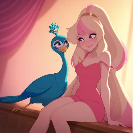 Aprhodite: aphr0dite, 1girl, blonde hair, white hair, breasts, pink hair, cleavage, multicolored hair, two-tone hair, big hair, eyelashes, makeup, very long hair, bare shoulders, pink eyes, purple eyes, pink dress, short dress, bare shoulders, sleeveless dress