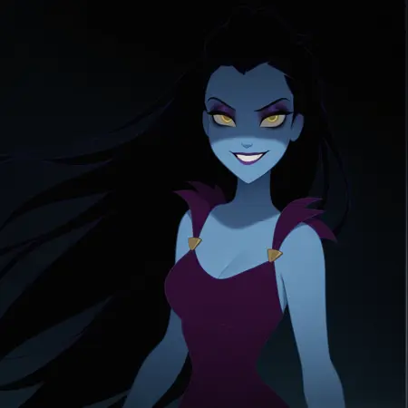 Nyx: n1x, 1girl, black hair, very long hair, yellow eyes, breasts, cleavage, dark purple dress, colored skin, purple lips, blue skin, eyeshadow, hair slicked back