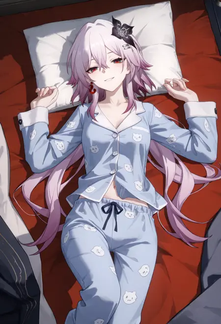 evernight \(honkai: star rail\), hair flower, seductive smile, pajamas, on bed, on back, from above
