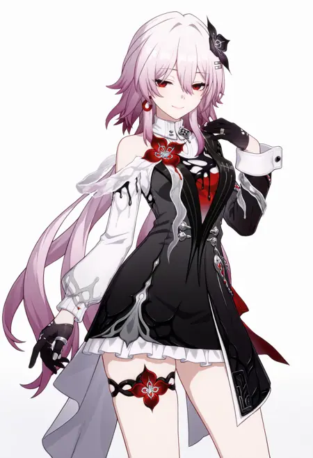 evernight \(honkai: star rail\), seductive smile, hair flower, multicolored dress, black dress, white dress, black gloves, thigh strap, cowboy shot, white background