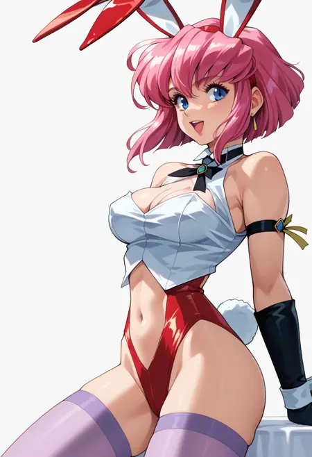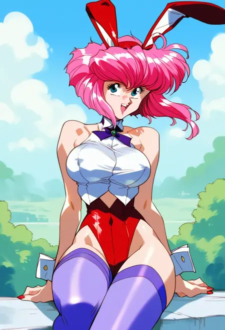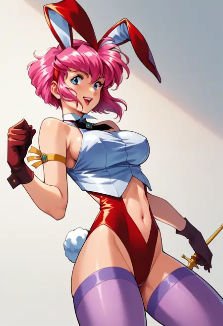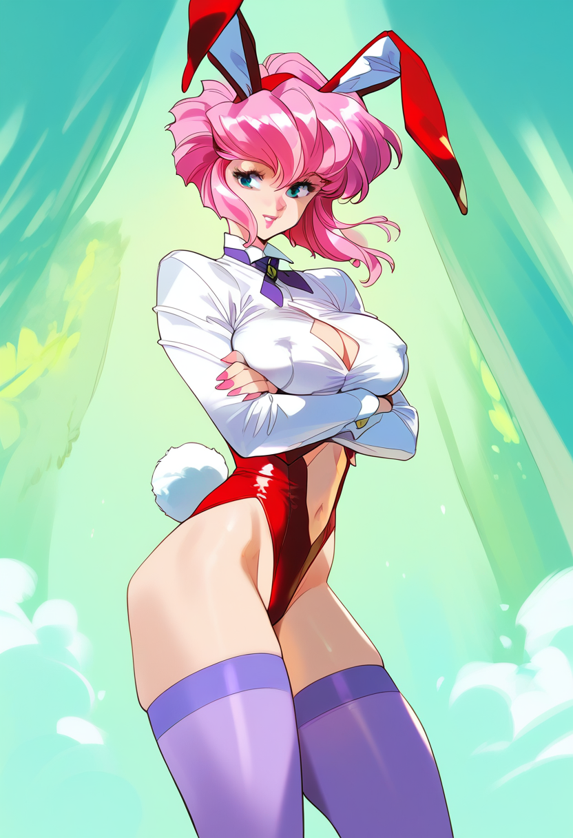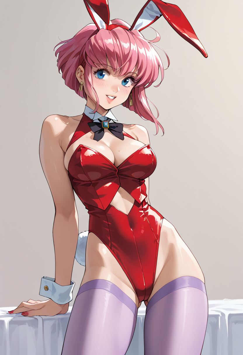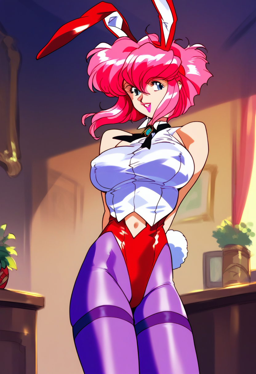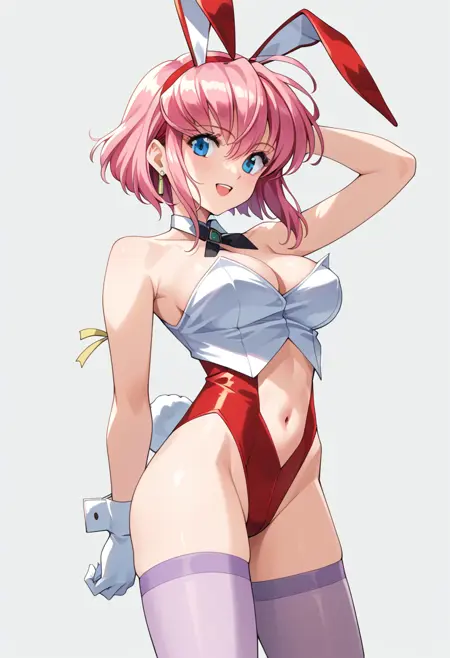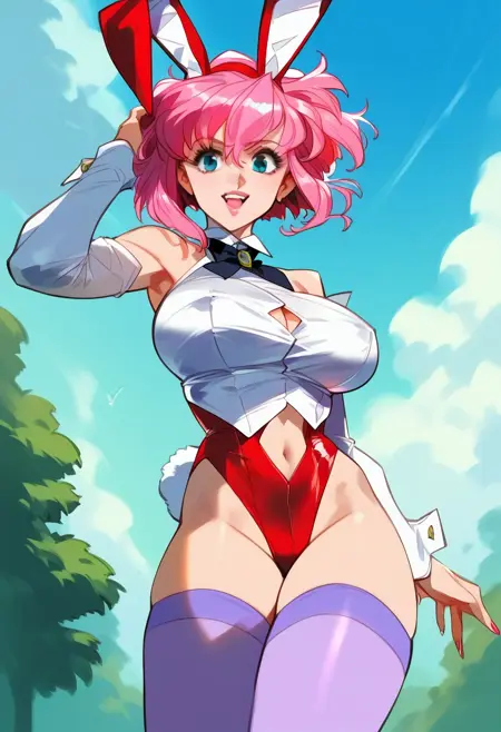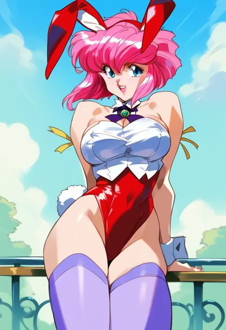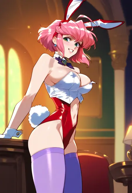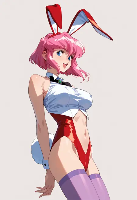触发词:mmayotakono,兔耳女性,短发,粉发女性,乳房,花花公子兔女郎,过膝长筒袜,紧身衣,1990年代(风格)