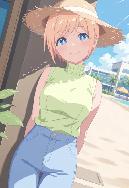 GacenSheryl, blue eyes, white pupils, blonde hair, short hair, swept bangs — Add "mature female" if you want to accentuate those features