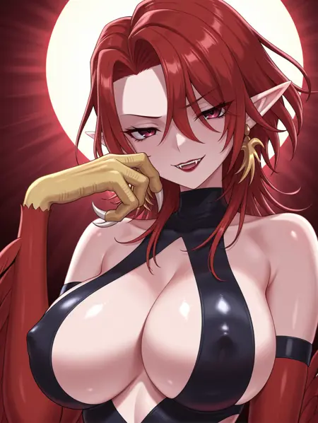 Tags (clothes): red winged arms, talons, purple pantyhose, gold bird earrings, animal hands, black revealing clothes, black stirrup legwear,