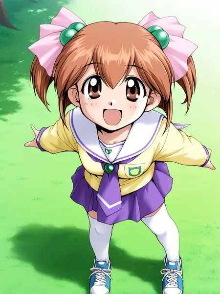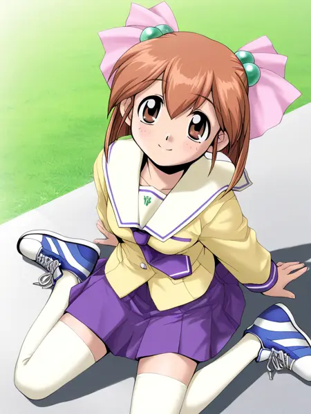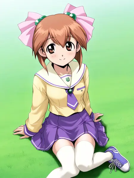 黄色のセーラー服、紫色のネクタイ、紫色のスカート,