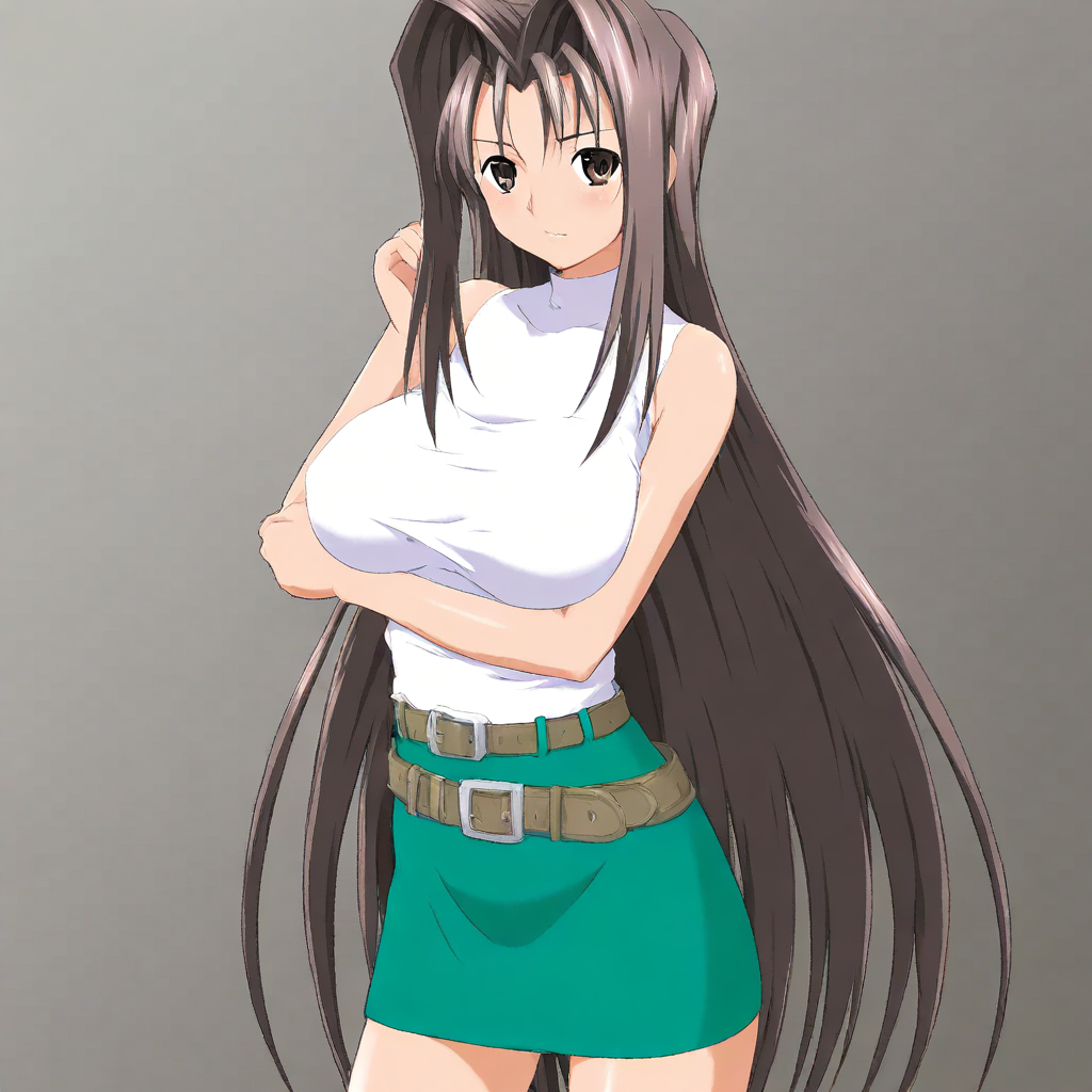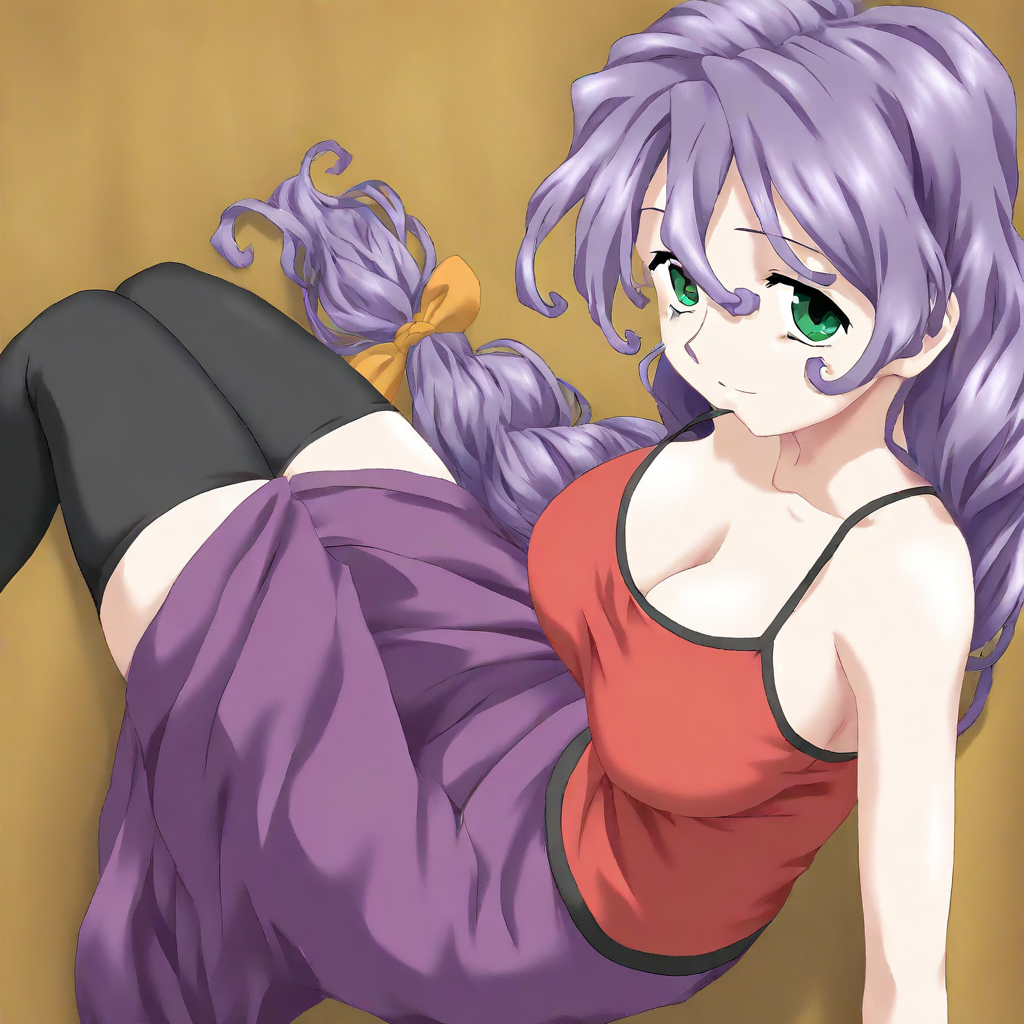 kagari-default, red tank top, spaghetti straps, cleavage, purple skirt, long skirt, black thighhighs,
