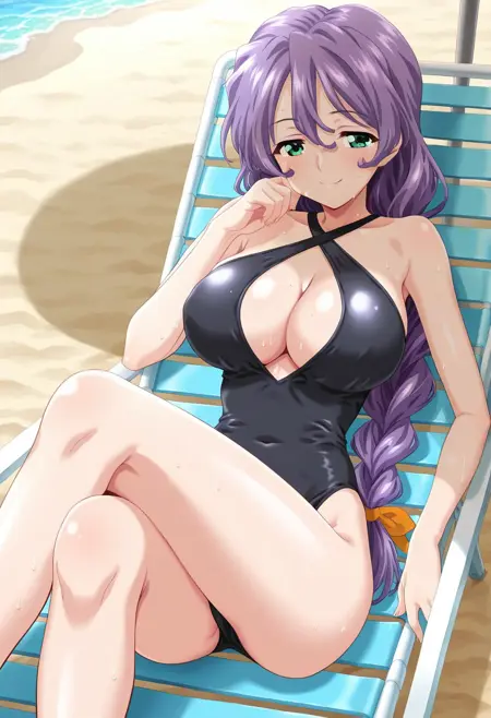 kagari-san, purple hair, long hair, wavy hair, hair between eyes, braided ponytail, green eyes, large breasts,