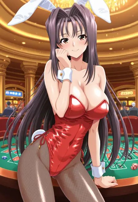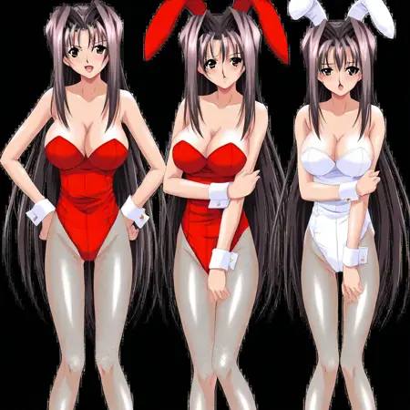 chisato-bunny, bunny suit, red leotard, white bunny ears, cleavage, bare shoulders, wristcuffs, fishnet pantyhose,