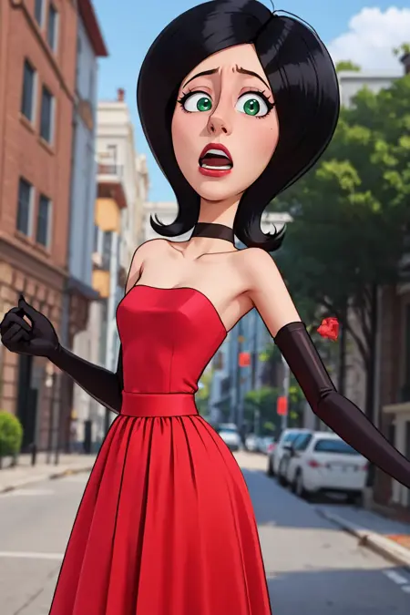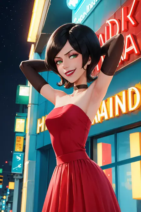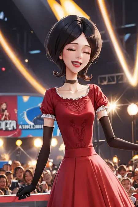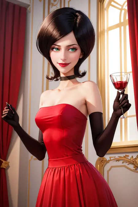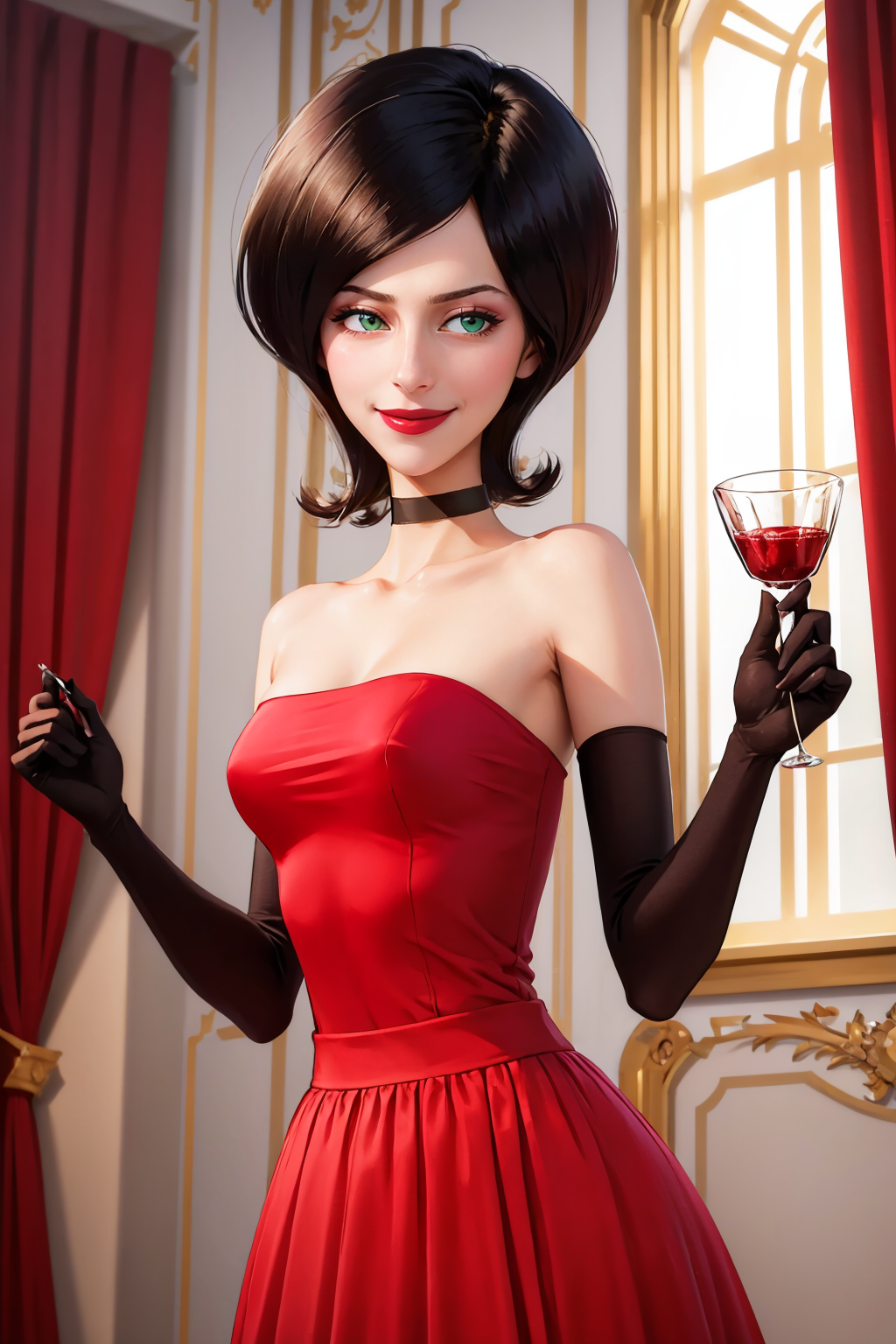 Add "choker, red dress, red skirt, strapless, elbow gloves, lipstick" for her typical look.