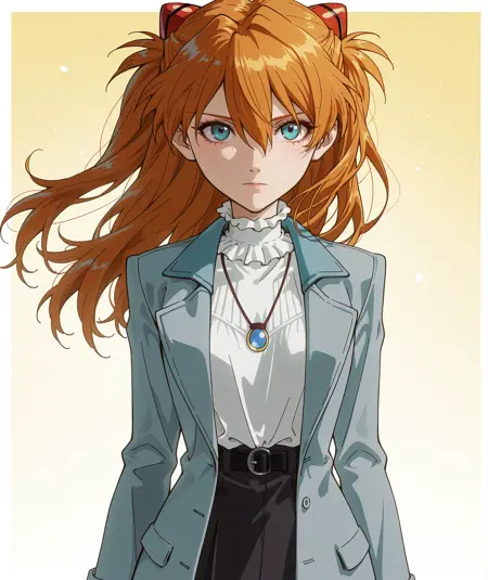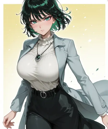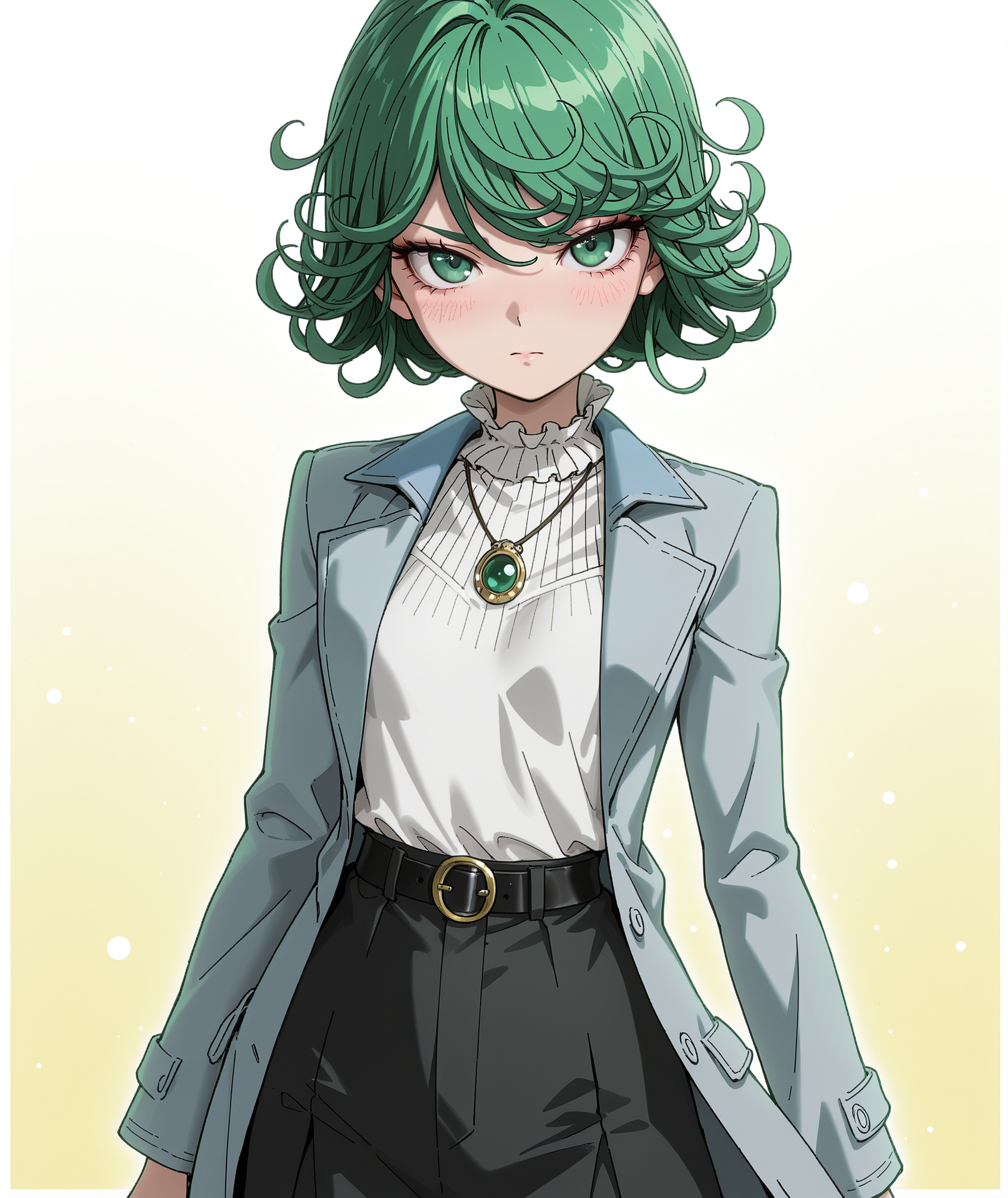 1. shirt, long sleeves, jewelry, jacket, white shirt, frills, open clothes, necklace, open jacket, coat, blue jacket, open coat, pendant, grey jacket, shirt tucked in, frilled shirt, grey coat, gem, brooch,