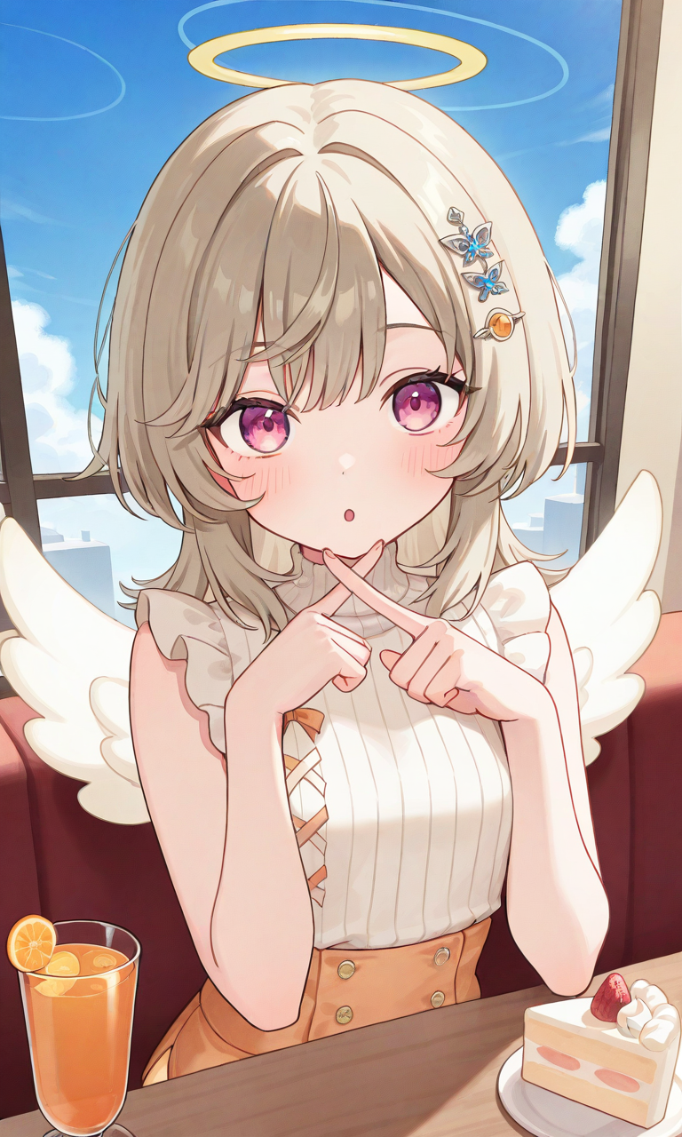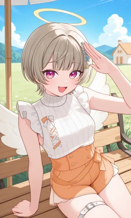 ヘアアクセサリー, ハロ, 白いベレー帽, 天使の翼, 白いジャケット, クロップドジャケット, リブニット, ハイウェストショーツ, オレンジ色のショーツ, 太ももストラップ- ジャケットを外したい場合は、