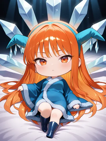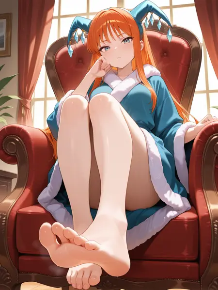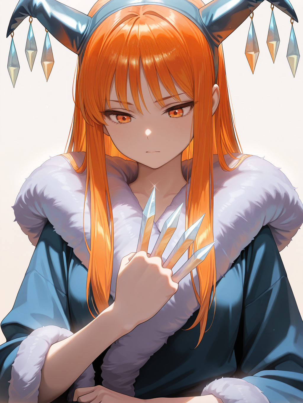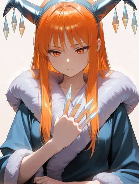Tags (clothes 2): wide sleeves, blue fur coat, blue headdress, blue high boots, official alternate costume, orange hair