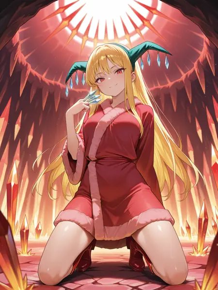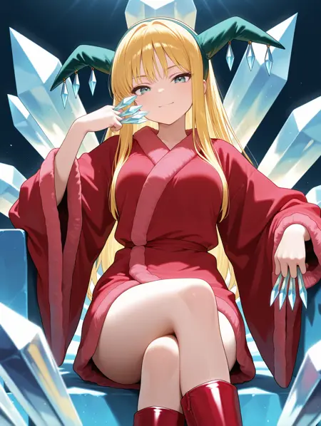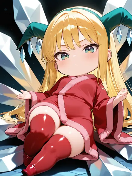 Tags (clothes): wide sleeves, red fur coat, green headdress, red high boots,