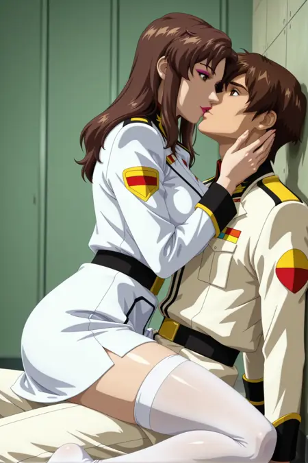 ilmurrueramius, 1girl, 1boy, brown hair, uniform, thighhighs, military uniform, brown eyes, hetero, long hair, skirt, breasts, military, large breasts, lipstick, girl on top, makeup, jacket, kiss <lora:illustrious-murrue ramius 1344x768:1>