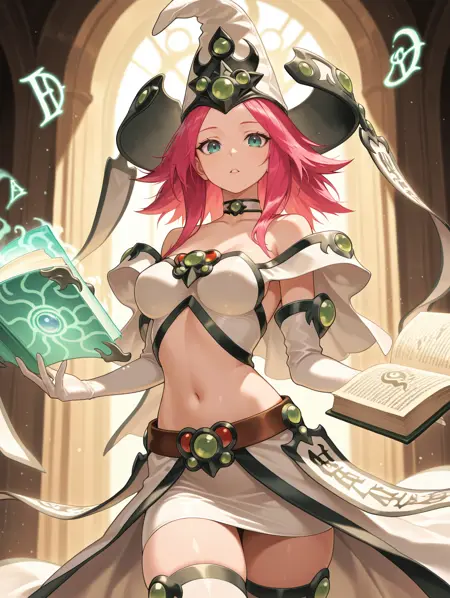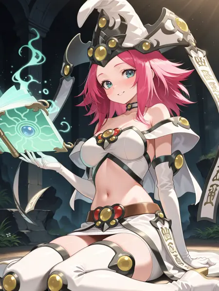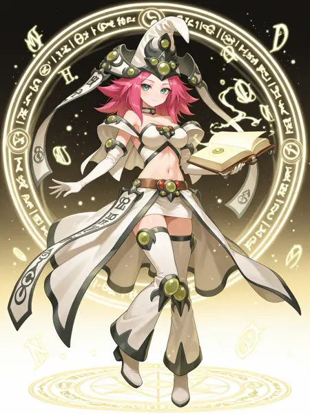 태그(복장): 흰색 마법사 모자, 흰색 목걸이, 흰색 겉옷, 흰색 크롭탑, 흰색 팔뚝 장갑, 흰색 허리 겉옷, 흰색 하의,