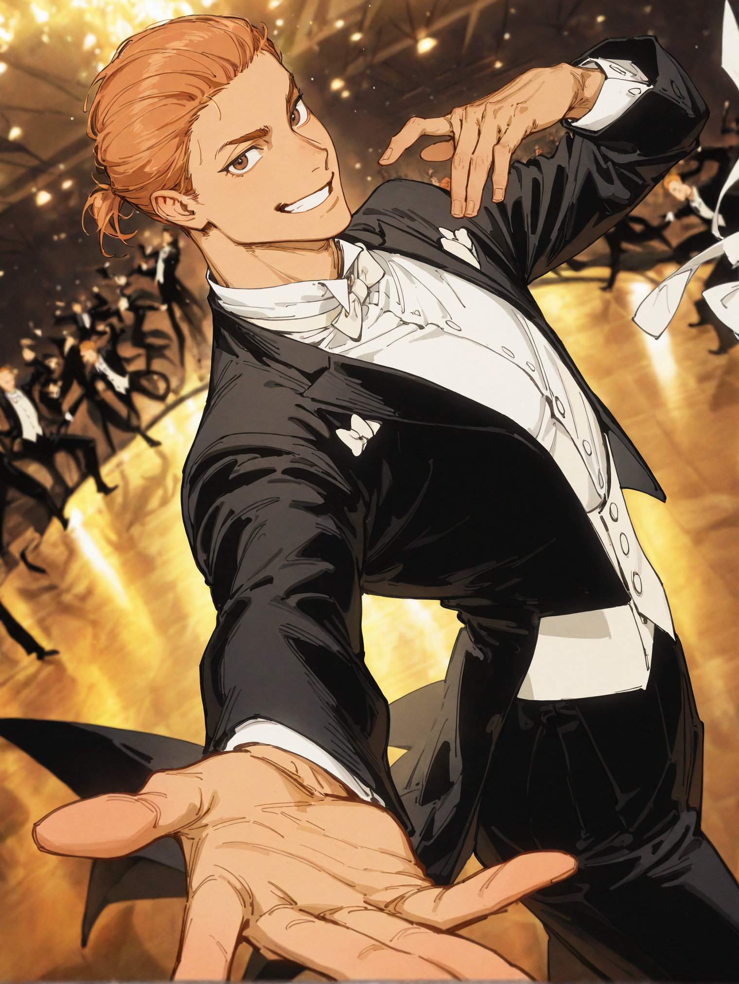 白いシャツ、白い蝶ネクタイ、白いベスト、黒いタキシード、黒いズボン、