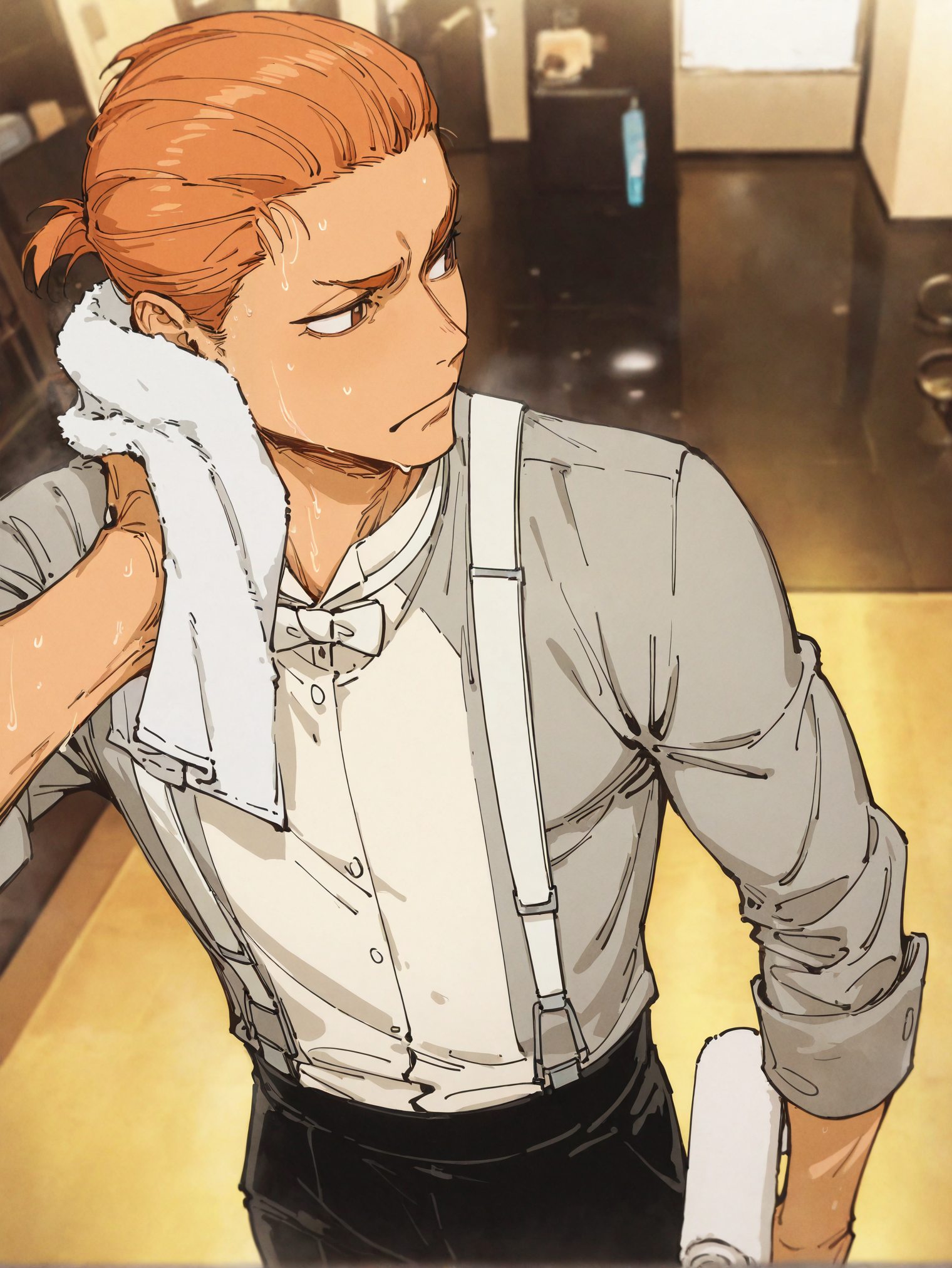 白と灰色のシャツ、白い蝶ネクタイ、サスペンダー、黒いズボン、