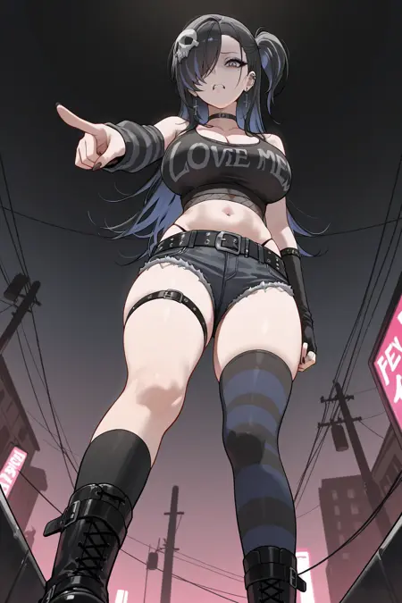 Trigger : jessynair, long hair, black hair, multicolored hair, hair over one eye, side ponytail, mole under eye, skull hair ornament, ear piercing, cross earrings, eyeshadow, blue eyes, black choker, spiked chocker, cleavage, gothic punk, tank top, fishnets, clothes writing "Love me plz", large breasts, single arm warmer, single fingerless glove, black fingernails, midriff, highleg panties, short shorts, denim shorts, thigh strap, single thighhigh, single sock, boots