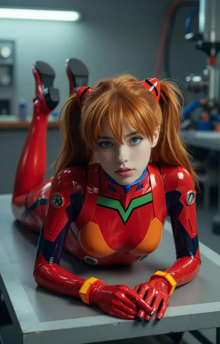 photo realistic, realistic, fluxasuka, solo, long hair, plugsuit, blue eyes, red bodysuit, ass, bodysuit, looking back, looking at viewer, orange hair, lips, sunlight, outdoors, legs apart, from behind, tree, shiny clothes, day, cowboy shot, hair between eyes, standing, pilot suit, skin tight, nature, nose, hair ornament, closed mouth, leaf, arm up, arm behind head, backlighting