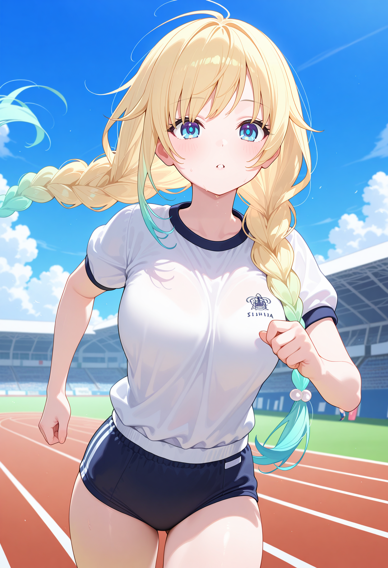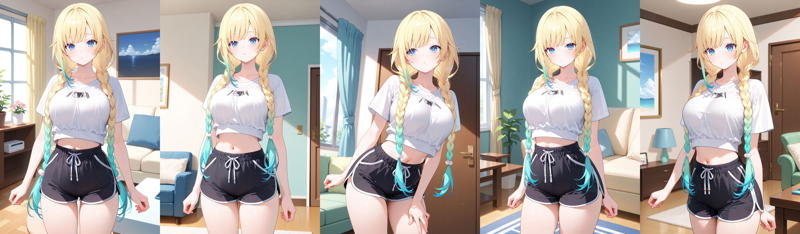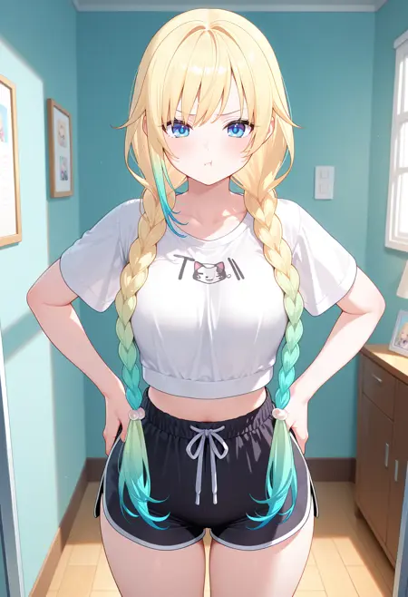 outfit4-2ddema, long hair, gradient hair, blonde hair, twin braids, blue eyes, t-shirt, white shirt, short sleeves, midriff, short shorts, black shorts