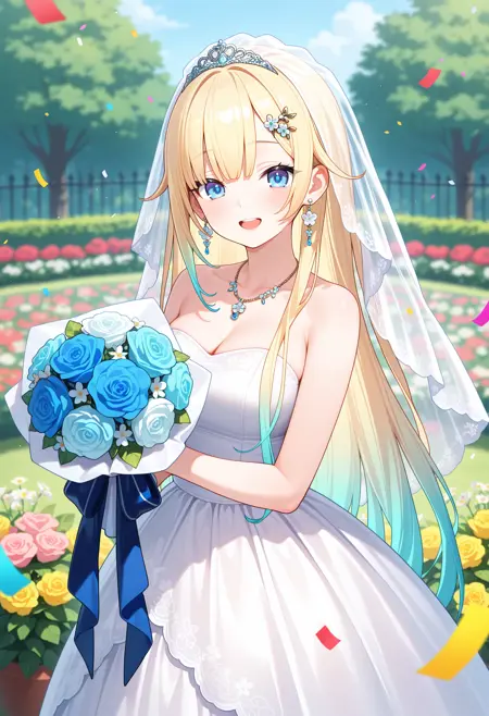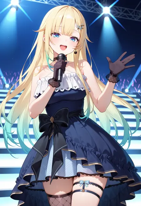 outfit1aaema, long hair, gradient hair, blonde hair, hair ornament, earrings, blue eyes, lace choker, bare shoulders, halterneck, frills, blue dress, black gloves, black bow, thigh strap, single thighhigh, fishnet thighhighs