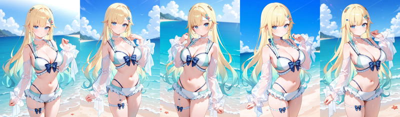 outfit5eeema, long hair, gradient hair, blonde hair, hair ornament, earrings, blue eyes, white choker, frilled bikini, white bikini, blue bow, long sleeves, detached sleeves, see-through sleeves, thigh strap, single garter strap