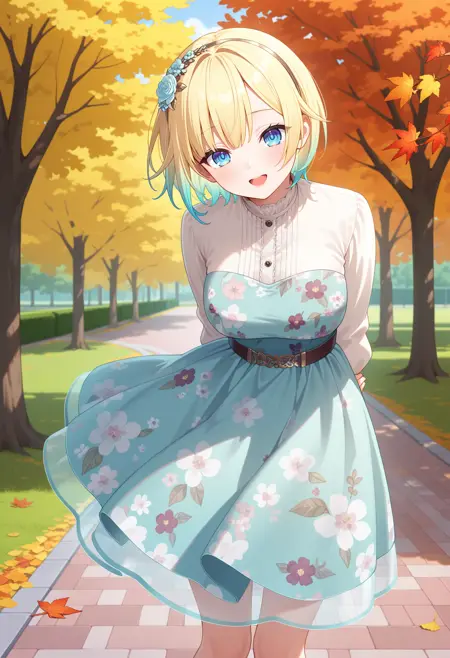 outfit3ccema, short hair, blonde hair, gradient hair, hairband, hair flower, blue eyes, white shirt, floral print, print dress, aqua dress, long sleeves, belt