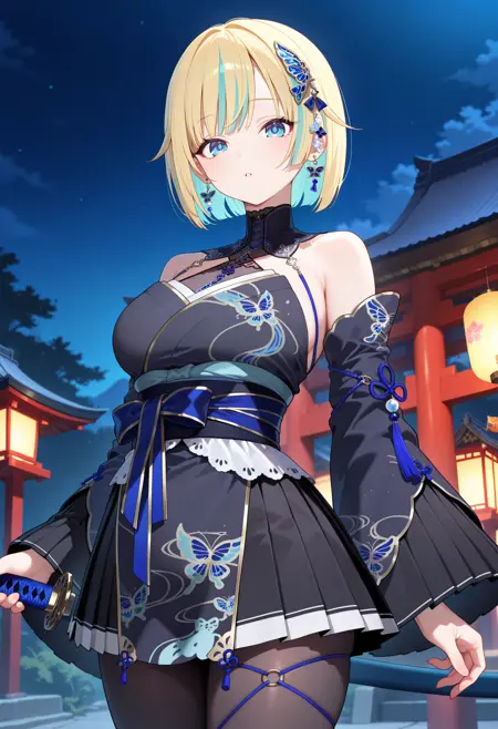 outfit6ffema, short hair, streaked hair, blonde hair, bob cut, hair ornament, earrings, blue eyes, black kimono, sleeveless, detached sleeves, wide sleeves, sash, black skirt, pleated skirt. black pantyhose