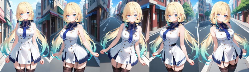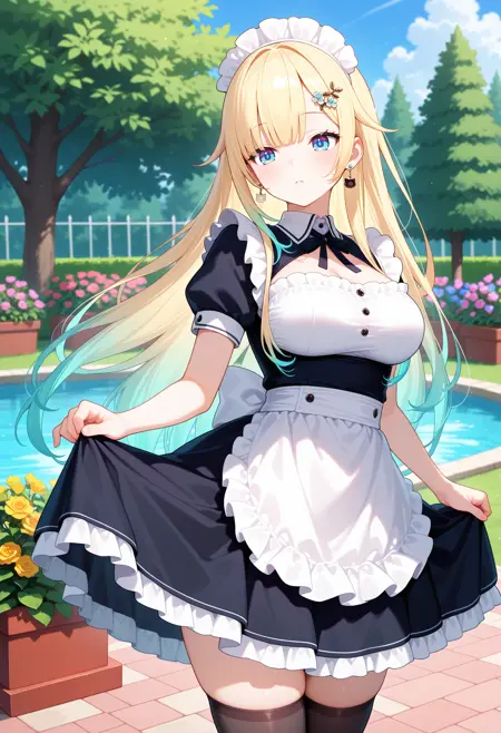 outfit2-2bbema, long hair, gradient hair, blonde hair, low twintails, hair ribbon, earrings, blue eyes, blue necktie, collared shirt, white dress, sleeveless, overskirt, garter straps, black thighhighs