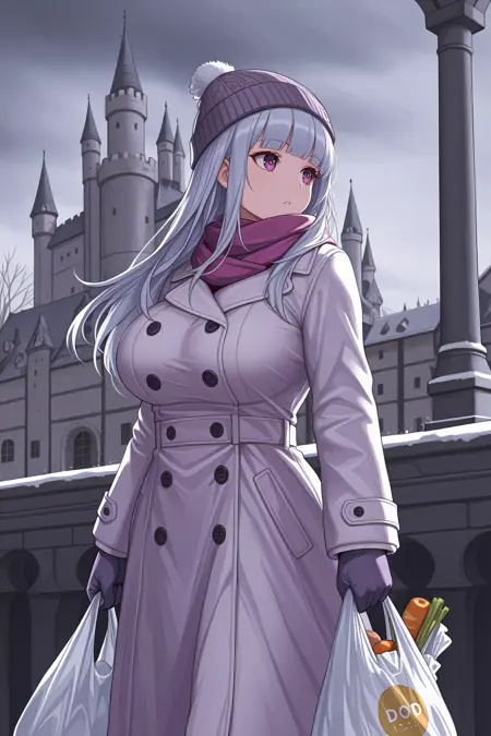 Appearance : d1d0, large breasts, purple eyes, grey hair, blunt bangs, long hair