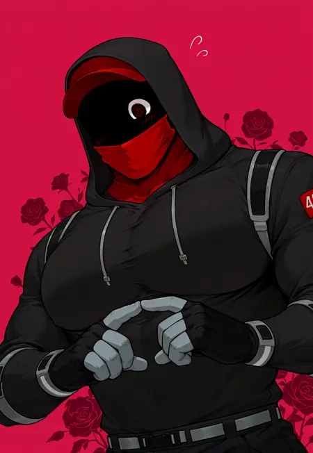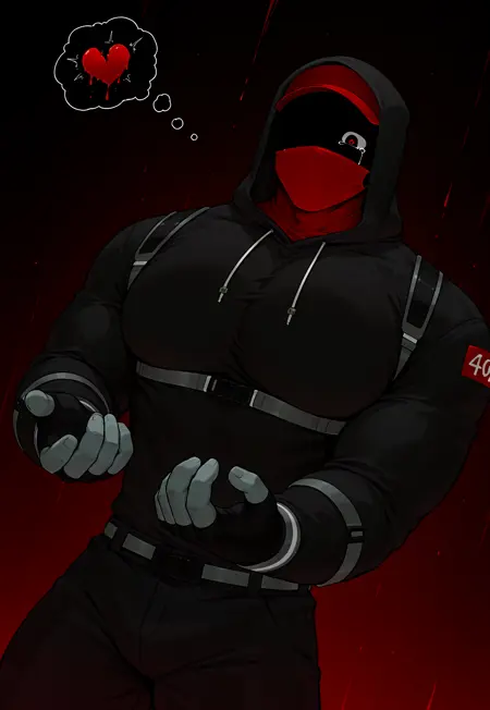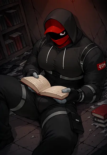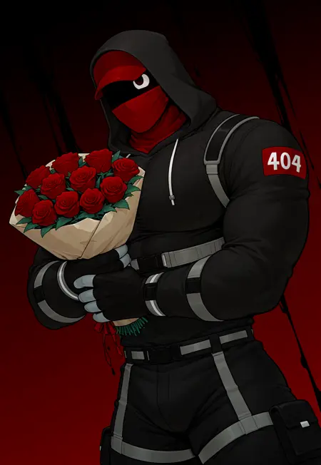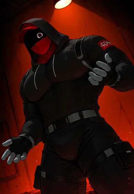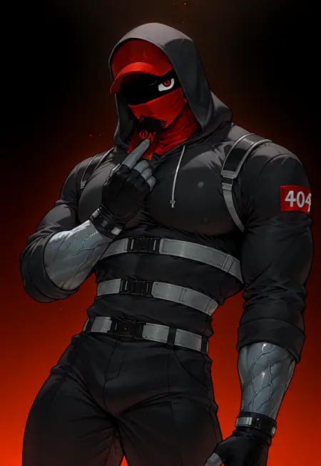 빨간 액센트가 있는 검은 후드 재킷, 검은 바지, 장갑, 전술 복장, 엠블럼_"404"