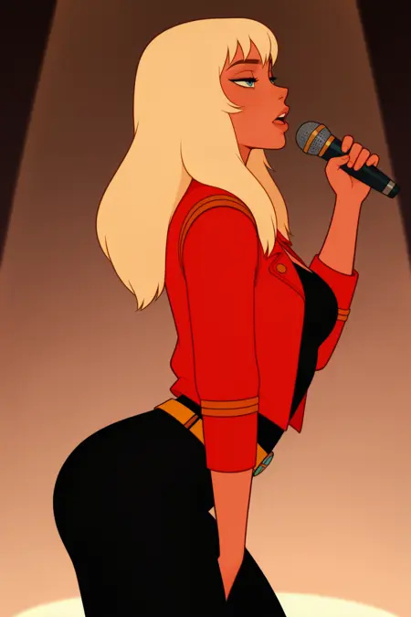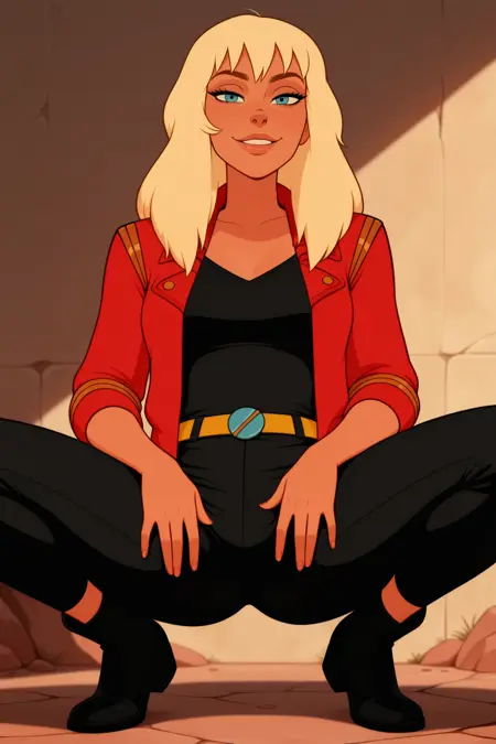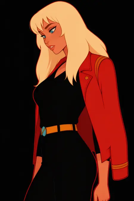 Angel_Rock_& _Rule, blonde hair, blunt bangs, long hair, blue eyes, nose, lips, medium breasts, red jacket, black pants, black shirt, belt, black boots, cartoon